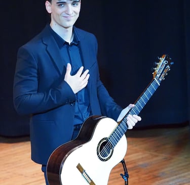 "As a classical guitarist, I am dedicated to solo performance, valuing artistry, hard work, and musical connection. I approach performance as a journey of expression and storytelling, aiming to create meaningful experiences for every audience. Through my repertoire, which spans from timeless masterpieces to contemporary works, I strive to highlight the depth and beauty of classical guitar."